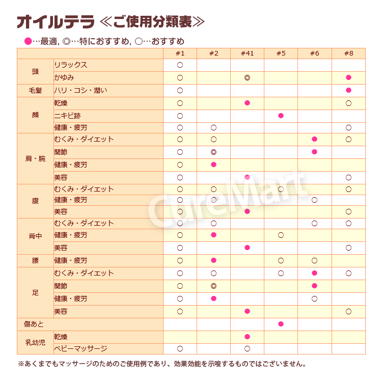 商品名オイルテラ W(腹部)規格・内容量200ml原材料・成分ヒマシ油、オリーブ油、ホホバ種子油、香料(天然由来の植物油)ご使用方法マッサージオイルとしてご使用ください。